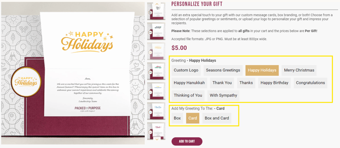 Select either Custom Logo or a greeting. Select whether you want the logo on the gift box, gift message card, or both. If you selected Custom Logo, make sure to upload your file. (For help, see Tips to Make Sure Your Logo Looks it's Best!) And then click, Add to Cart.